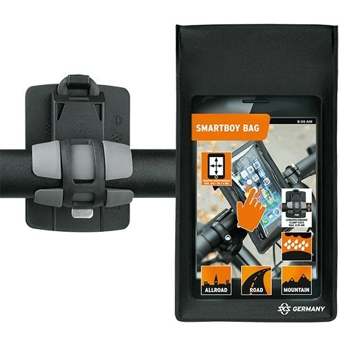 Durchblick? Aber sicher! Der SKS Smartphonehalter SMARTBOY lässt sich ganz flexibel am Fahrradlenker oder Kinderwagen montieren – und das komplett ohne Werkzeug. Die mitgelieferte Tasche für das Smartphone wird mit einem starken Klettband an der Handyhalterung befestigt. Durch die transparente Folie kann man das Handy bequem bedienen. Auch größere Smartphones lassen sich in der Handyhülle verstauen und sind so perfekt vor Spritz- und Regenwasser geschützt.