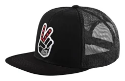 Die Troy Lee Designs Trucker Snapback im Peace Out Design verfügt über ein TLD-Logo auf der Vorderseite und einen verstellbaren Snapback,
